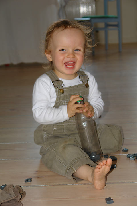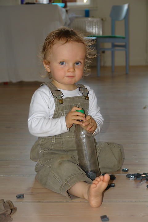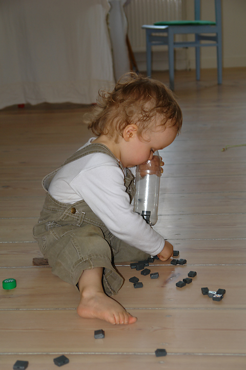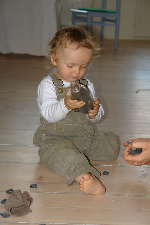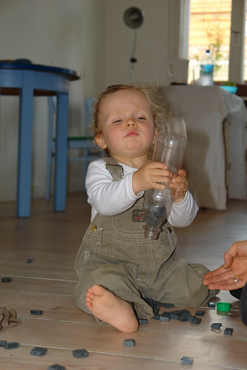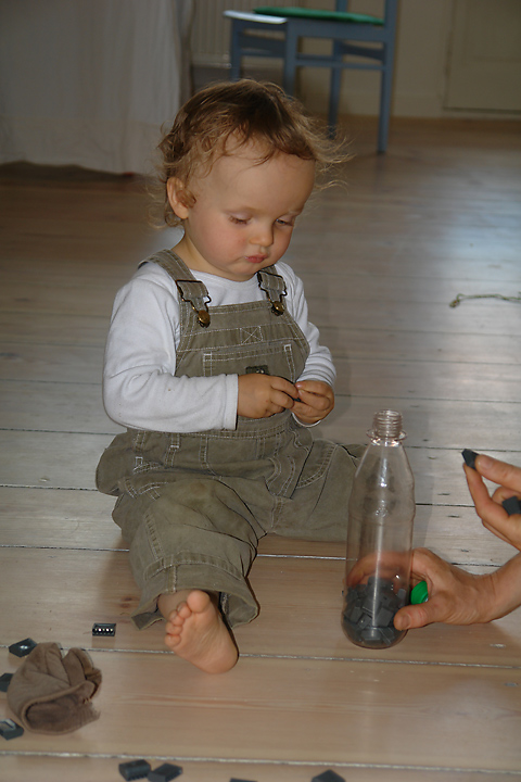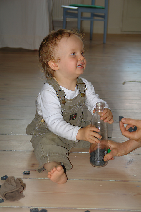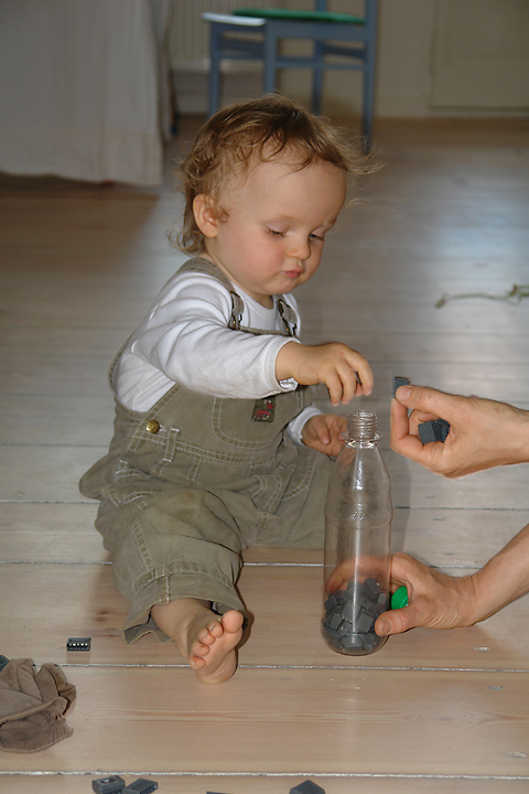 A. assistiert H. beim Befüllen einer Plastikflasche.